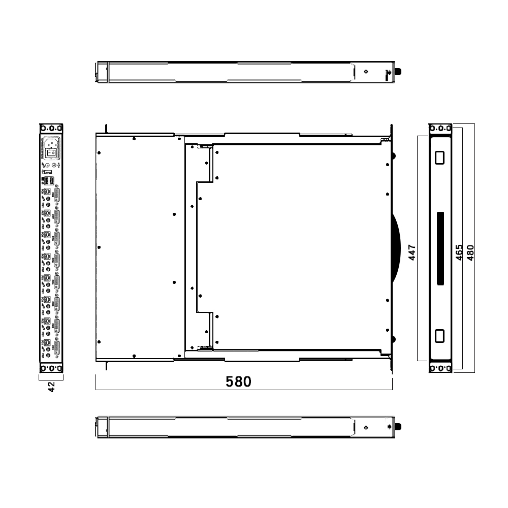 機架式抽拉設計允許LCD顯示器、鍵盤和觸控板。可控製8路DVI高清視頻信號、USB控製信號、和雙向音頻信號。