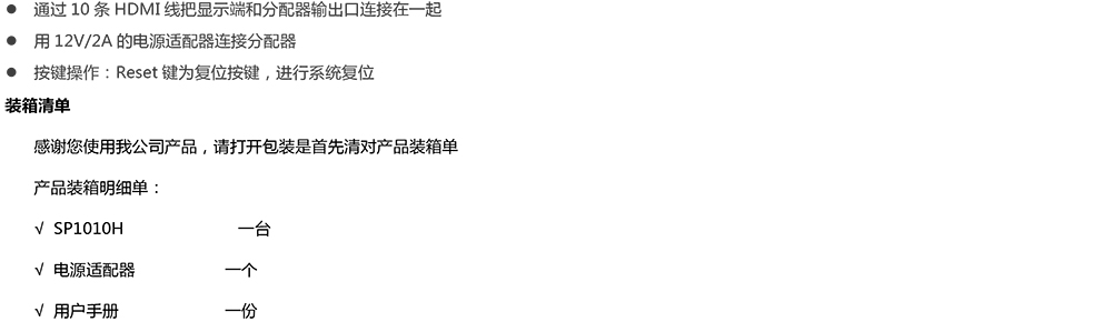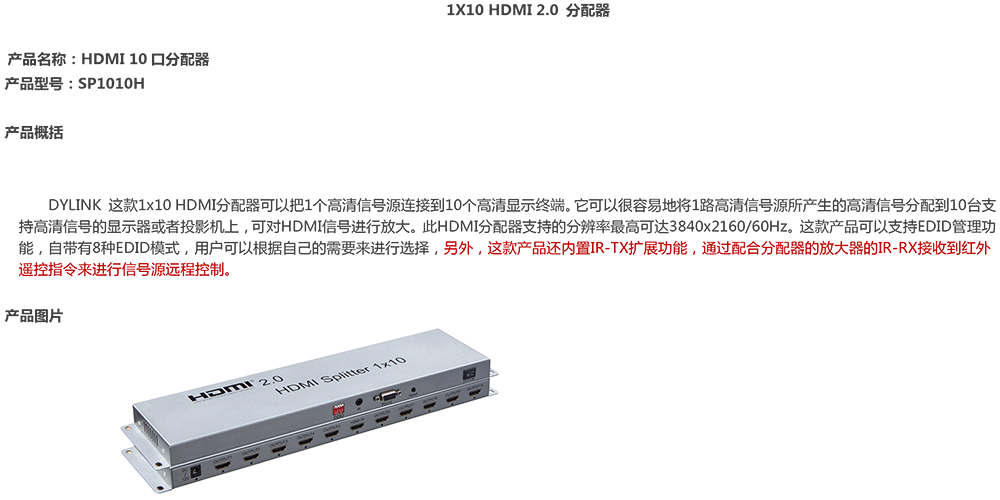一路HDMI視頻信號輸入同步分成10路HDMI信號輸出,畫麵同步,高清無損,支持HDMI2.0,分辨率可達3840*2160@60hz