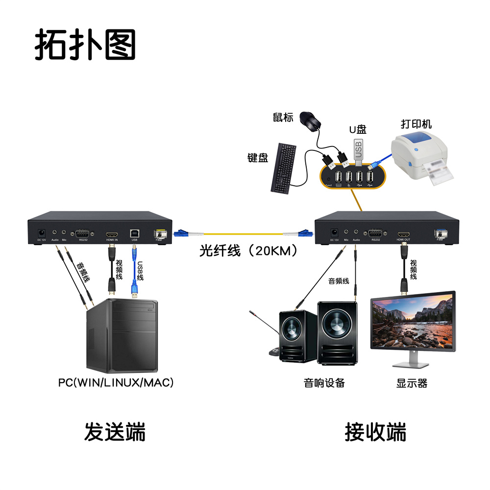 2.采用千兆數字編碼技術,把設備的本地發送端連接電腦主機的VGA視頻信號和USB控製信號等,通過光纖跳線連接(單模可傳輸20公裏,多模傳輸300-500米)至延長器的接收端 用戶可以在接收端使用操作電腦。