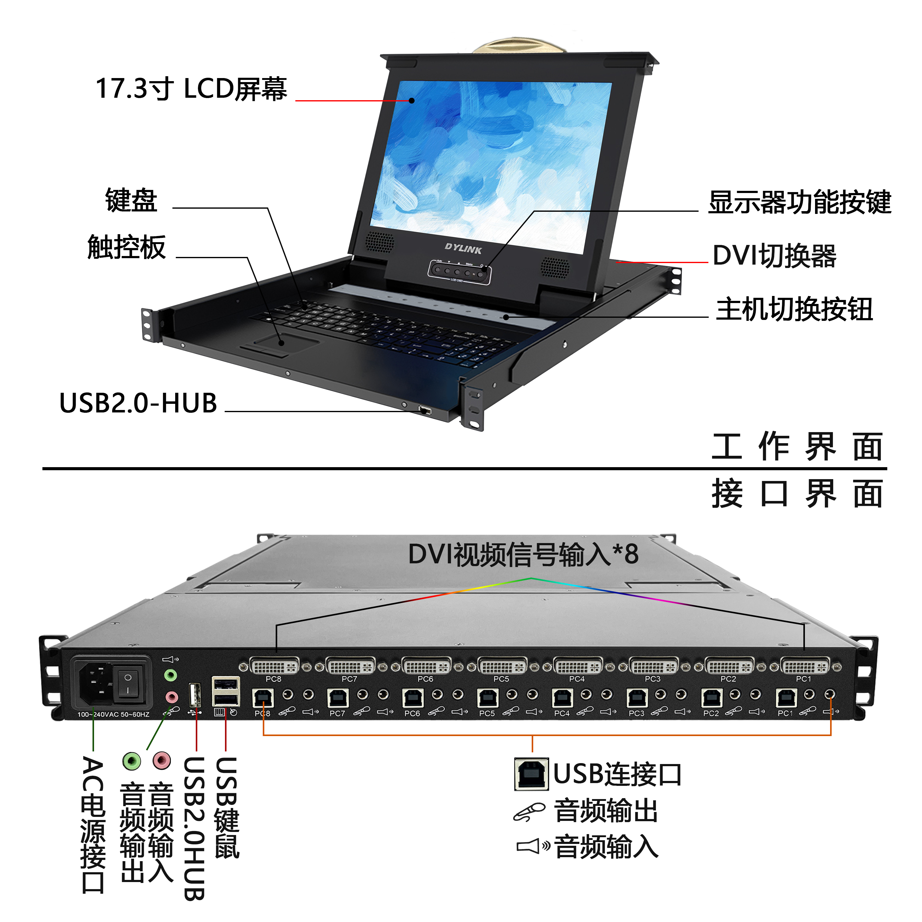 機架式抽拉設計允許LCD顯示器、鍵盤和觸控板。可控製8路DVI高清視頻信號、USB控製信號、和雙向音頻信號。