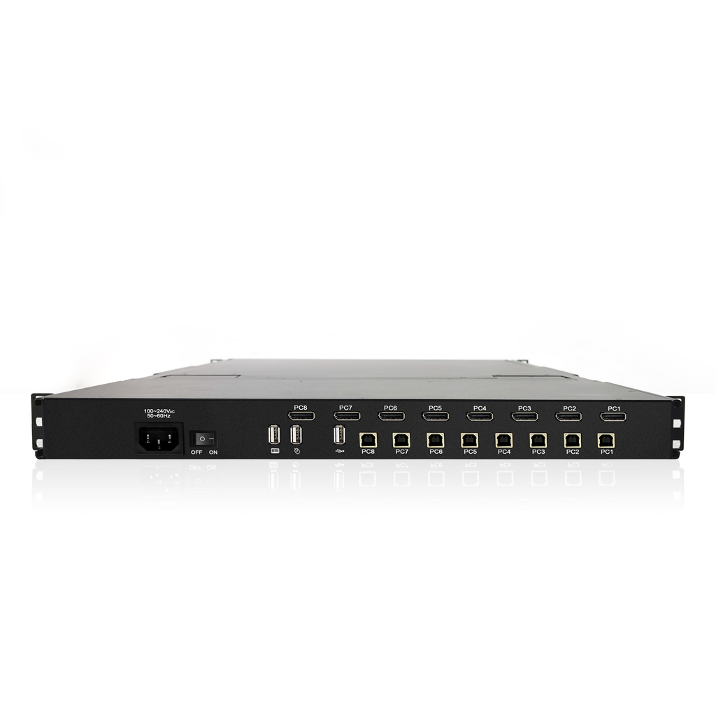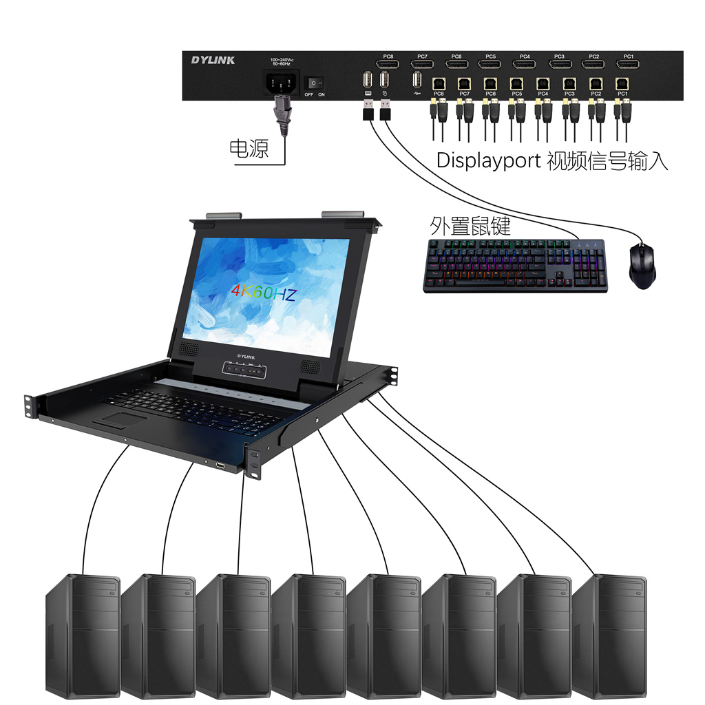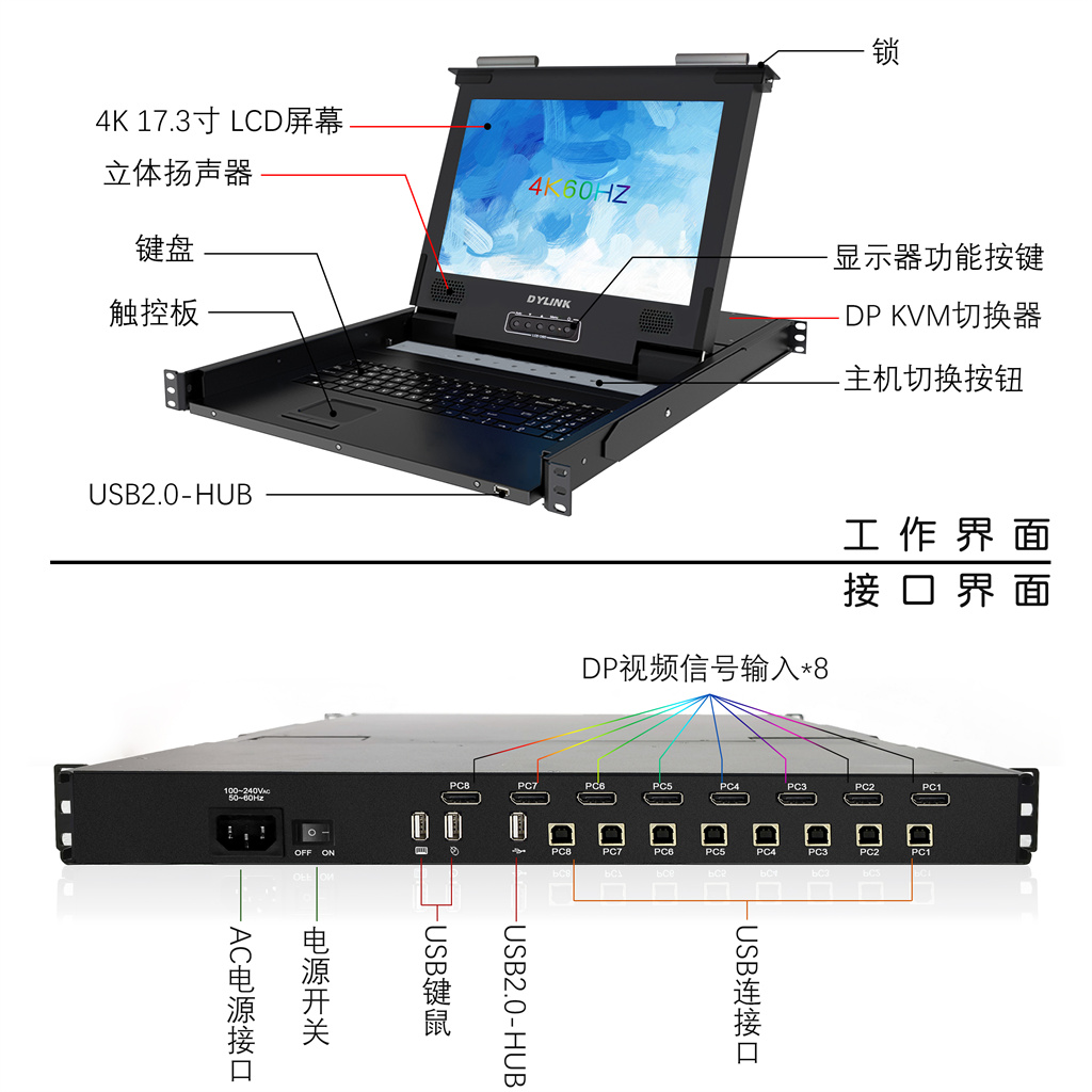 DY-SW1708DP-LCD Displayport 控製端為一款具備音視頻功能的4K KVM控製設備, DY-SW1708DP整合 8路KVM 控製端與 17 寸液晶屏於 1U 高度結構內從而管理 8 台電腦服務器Displayport 視頻輸入接口,可支持超高清數字視頻(4K@60Hz)顯示分辨率最高可達 3840 x 2160,並兼容 2560x1600, 2560x1440,1920 x 1200, 1920 x 1080等多種解析度,用戶可將抽拉式控製端與兼容的DYLINK KVM多電腦切換器或音視頻延長器搭配使用,單軌道設計允許LCD顯示器、鍵盤和觸控屏獨立進行操作。該控製端提供8路DP 4K高清視頻信號。允許將高分辨率顯示器連接控製端端口,或將兼容DP的切換器連接電腦端端口。 DY-SW1708DP前端麵板額外具備一組USB鼠標連接端口;後方麵板的外接式控製端(鍵盤、鼠標)。 |