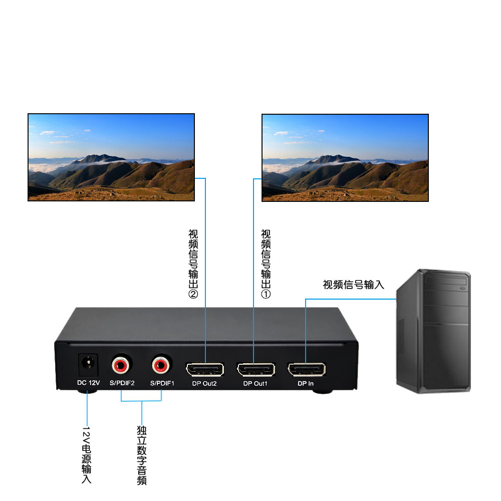 1. DisplayPort數字視頻分配器,能夠使1路DisplayPort數字視頻輸入信號無失真地在2路DisplayPort輸出口上同時顯示;