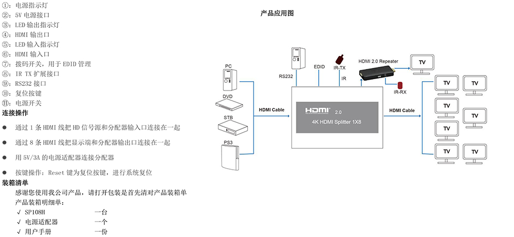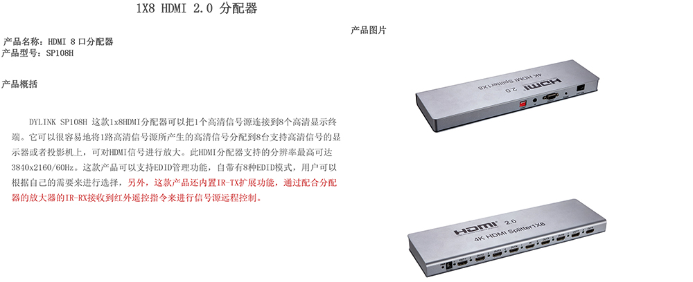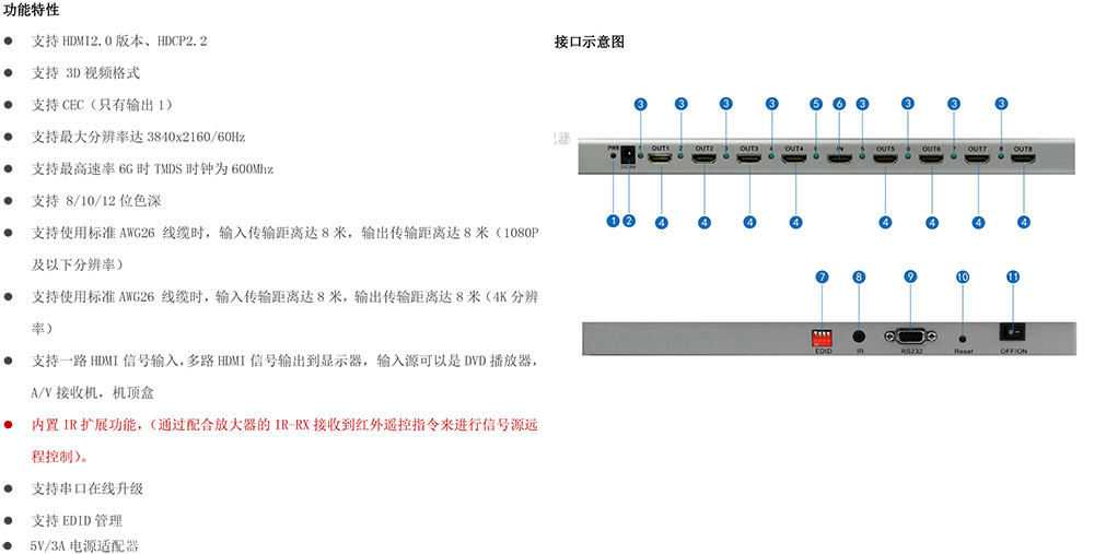 一路HDMI視頻信號輸入同步分成8路HDMI信號輸出,畫麵同步,高清無損,支持HDMI2.0,分辨率可達3840*2160@60hz