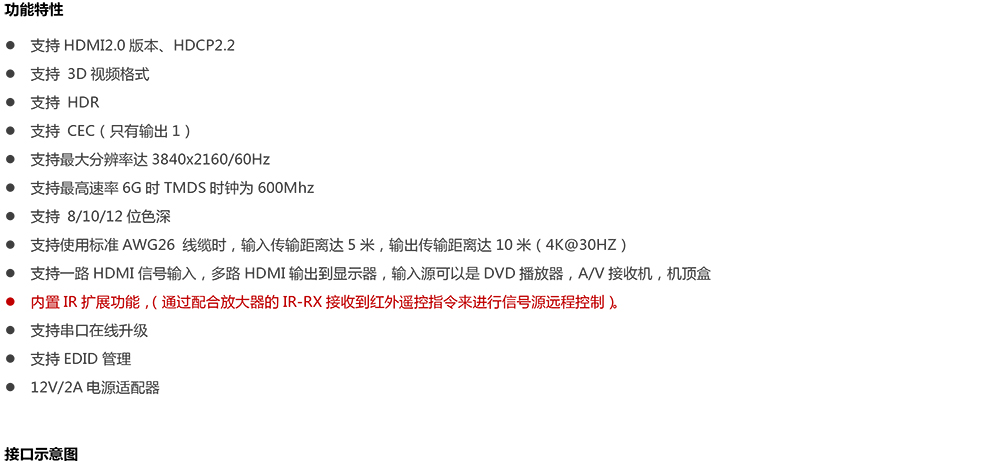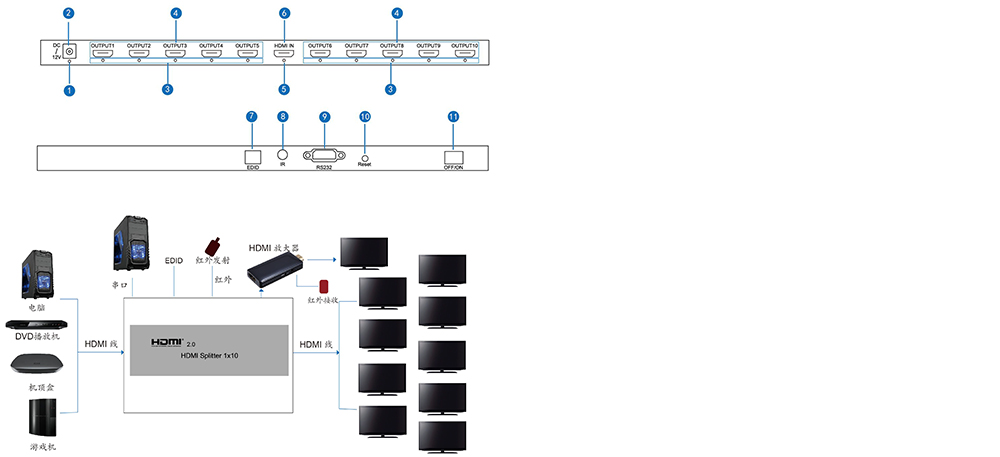 一路HDMI視頻信號輸入同步分成10路HDMI信號輸出,畫麵同步,高清無損,支持HDMI2.0,分辨率可達3840*2160@60hz