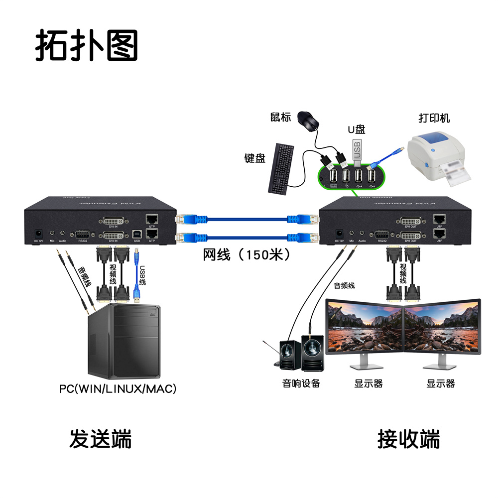 2.采用千兆數字編碼技術,把設備的本地發送端連接電腦主機的視頻信號和控製信號等,通過網線連接(可傳輸150米,穩定4K30hz)至延長器的接收端 用戶可以在接收端使用操作電腦。